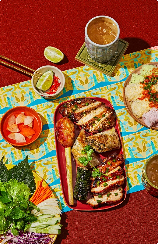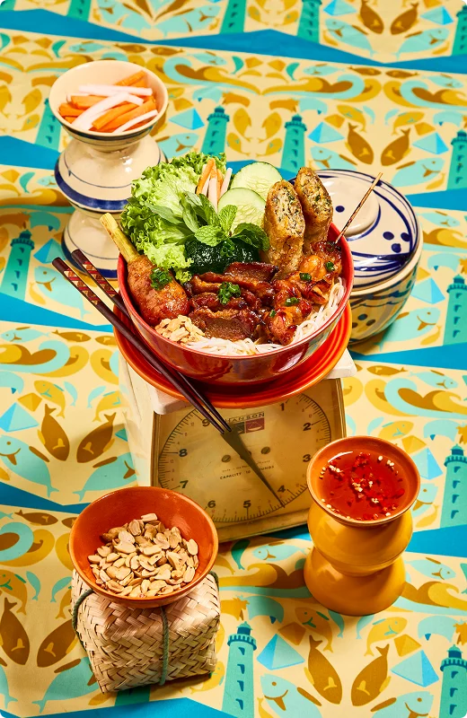 Dry Vermicelli with Mixed Meat (Grilled Pork & Chicken, Nem Nuong) and Crispy Spring Roll