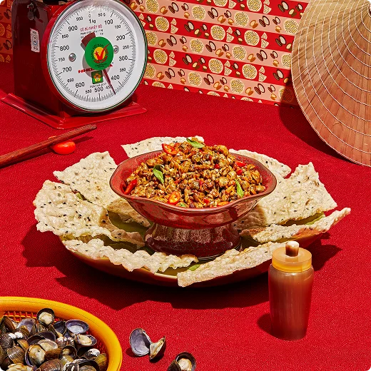 STIR – FRIED BABY CLAMS WITH RICE SESAME CRACKER